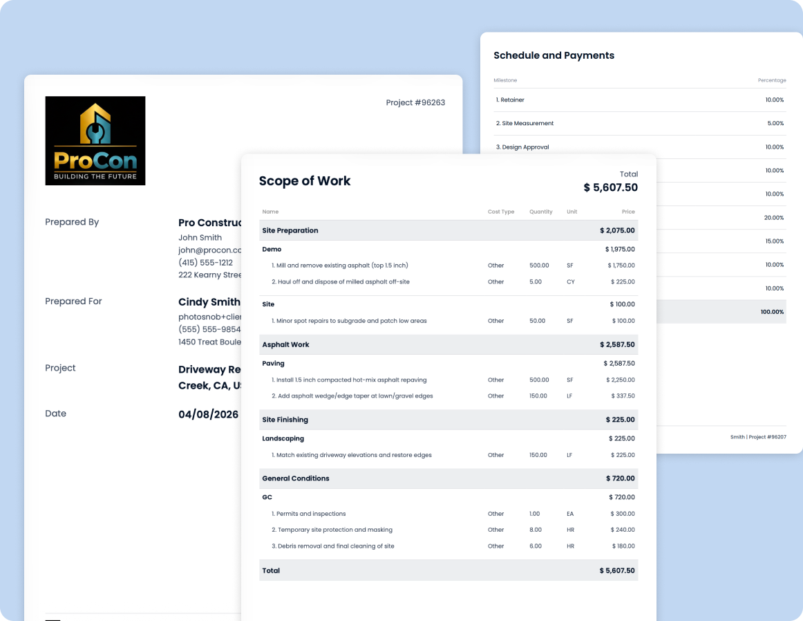 Paving jobs often move quickly — especially for commercial or maintenance work. A clean proposal process helps you win and schedule jobs faster.