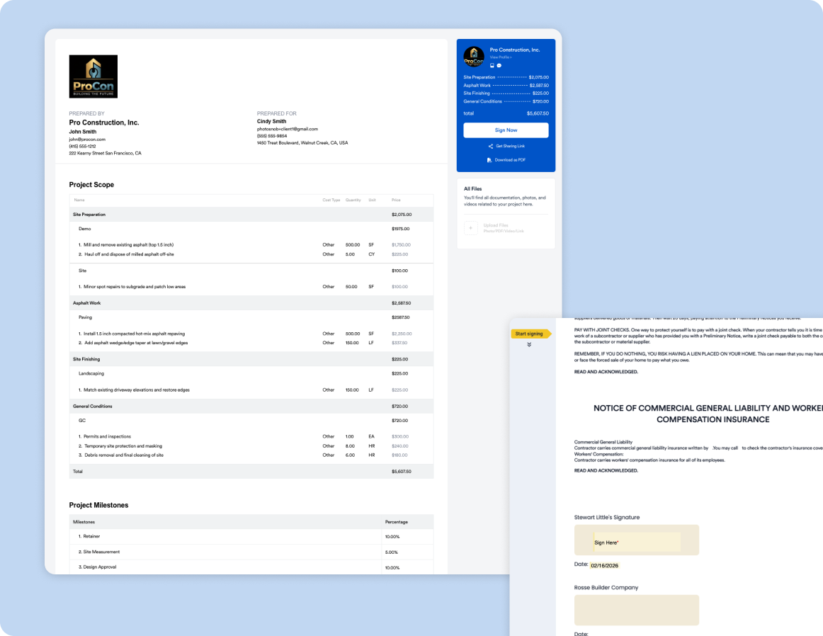Centralize communication, proposals, contracts, and job documentation.