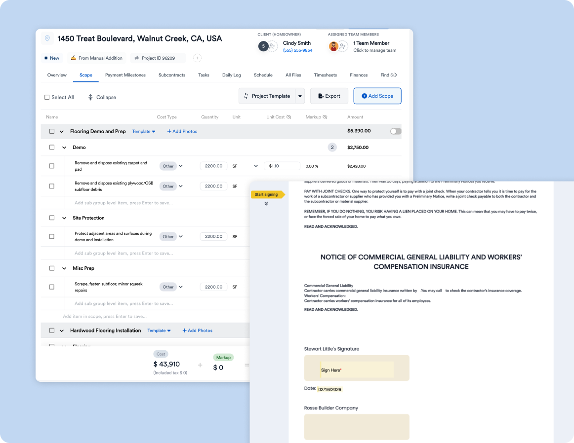 Flooring jobs move fast — from on-site measurements and material calculations to scheduling installers and managing client expectations. Eano gives flooring contractors a centralized system to estimate accurately, send professional proposals, and keep installs on track without juggling spreadsheets and paperwork.