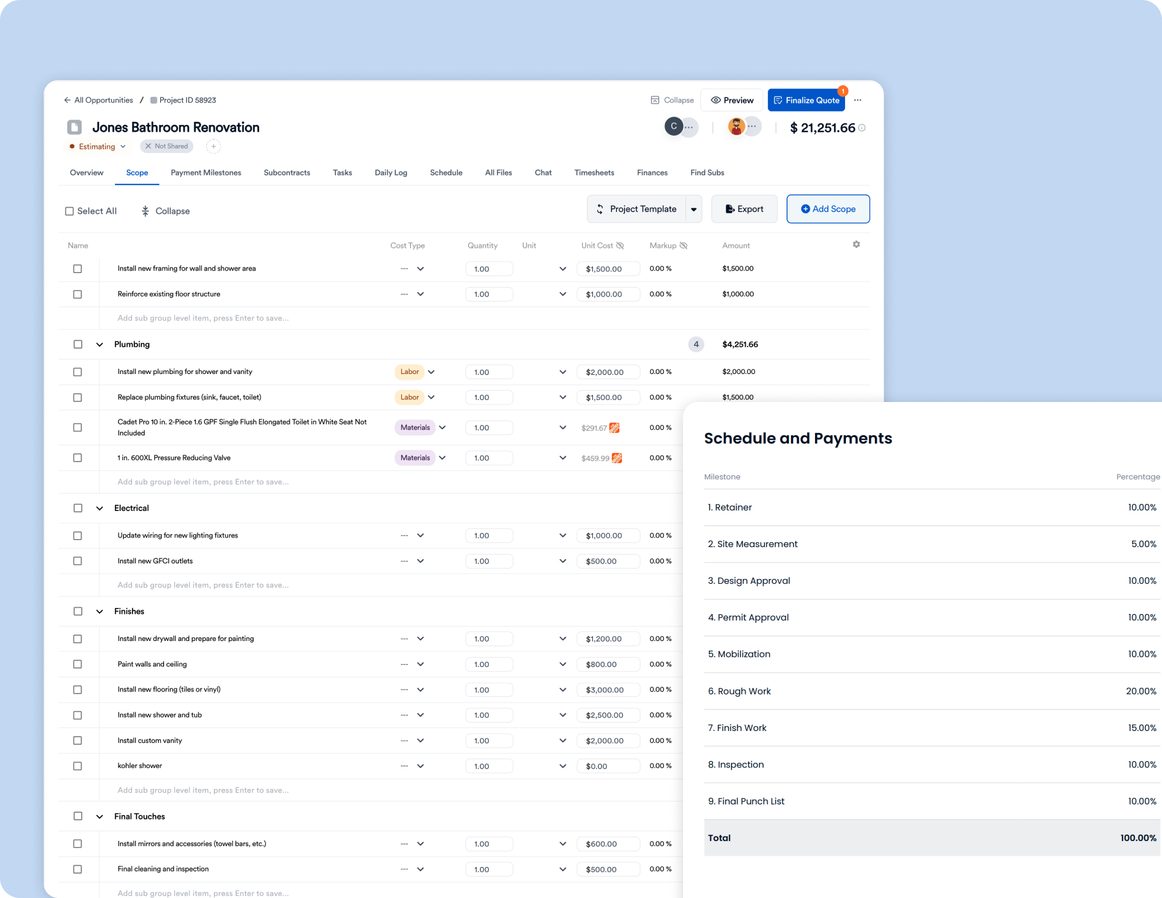 - Build fully line-itemized estimates across demo, framing, electrical, plumbing, drywall, finishes, and fixtures