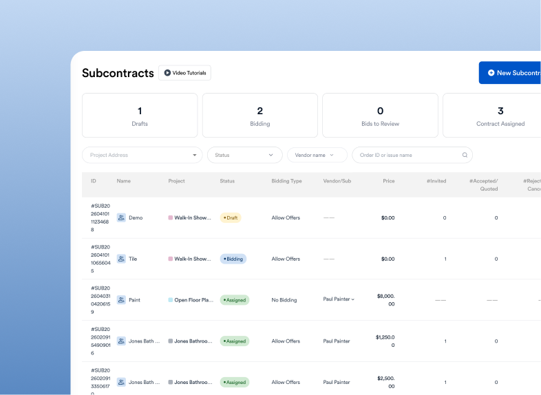 - Track job progress from initial demo through final walkthrough