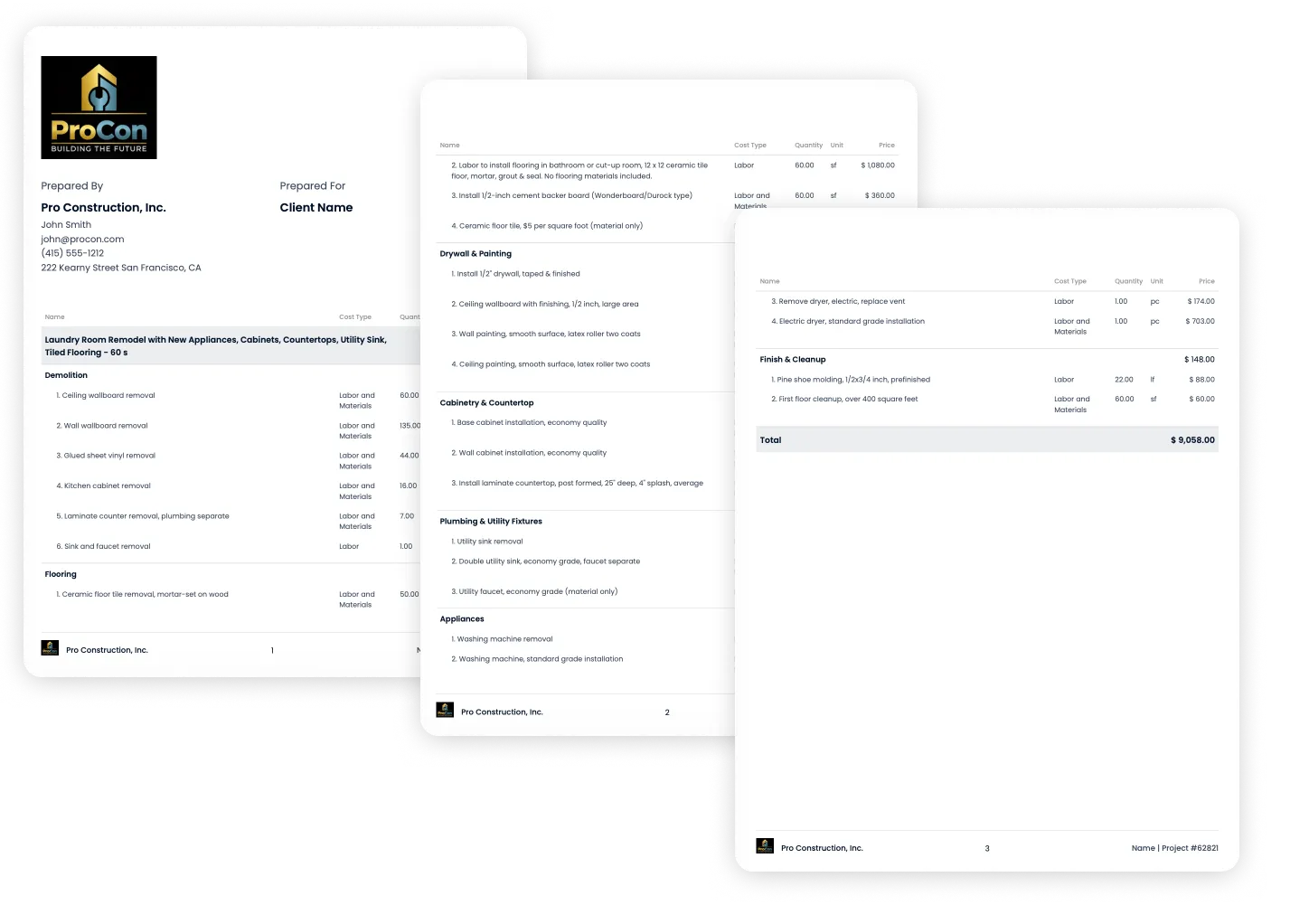 Based on a laundry room remodel totaling $9,058, this proposal includes detailed scope, quantities, and pricing across every phase of the job.