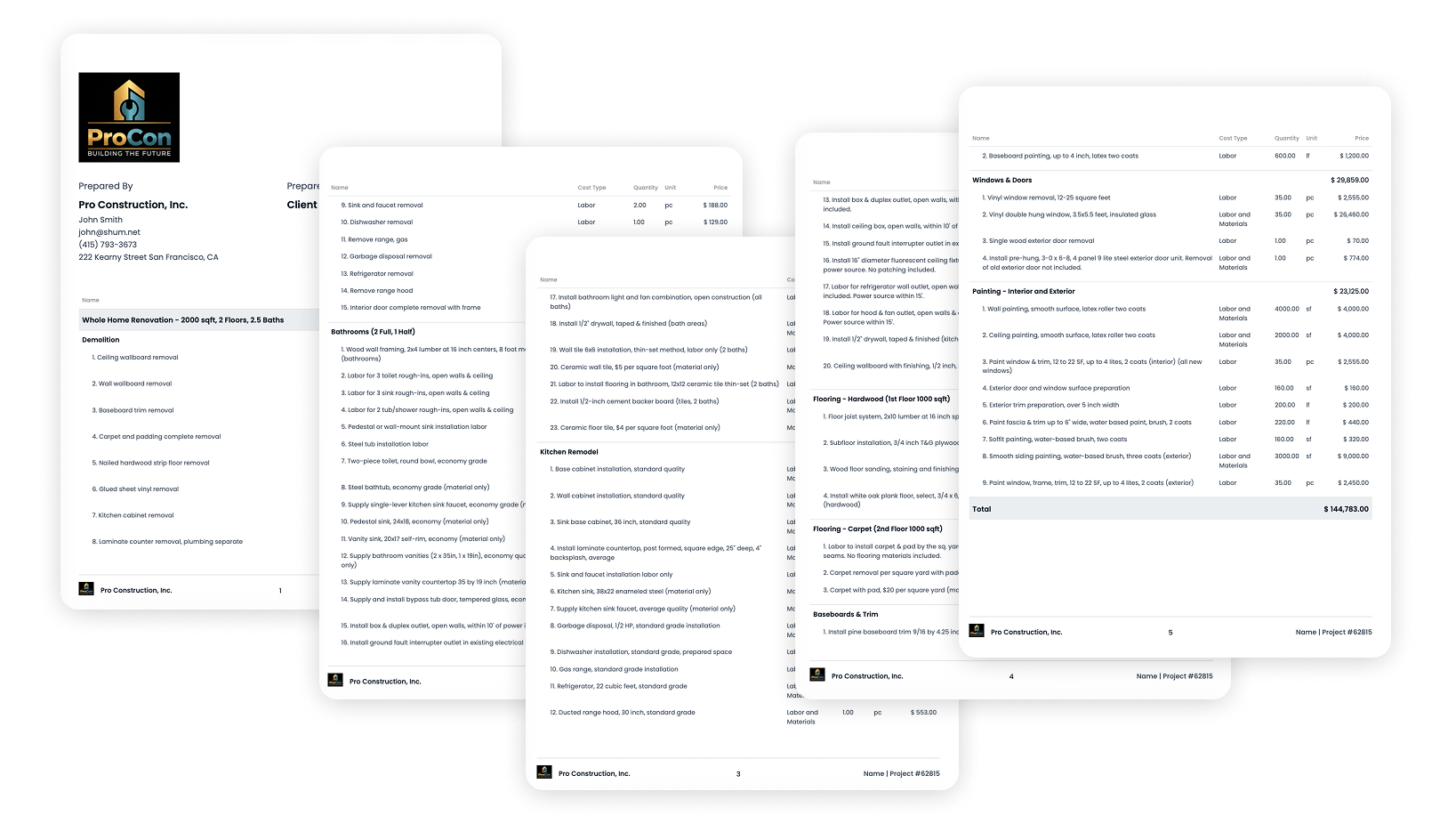 Based on a 2,000 sq ft, 2-floor home renovation with 2.5 bathrooms totaling $144,783, this proposal includes full scope breakdowns, quantities, and pricing across every phase of the project.