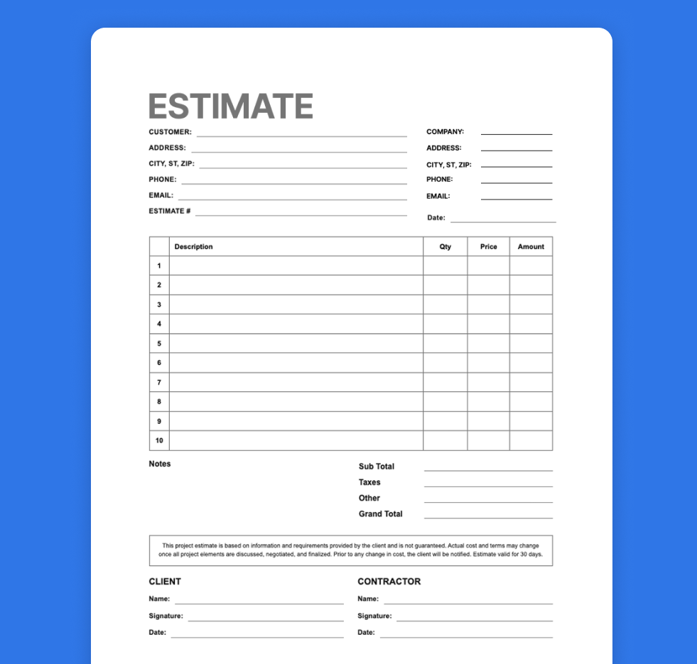 These forms are ideal for contractors who want flexibility—whether you're quoting a detailed remodel from your office or writing up a quick estimate from your truck.