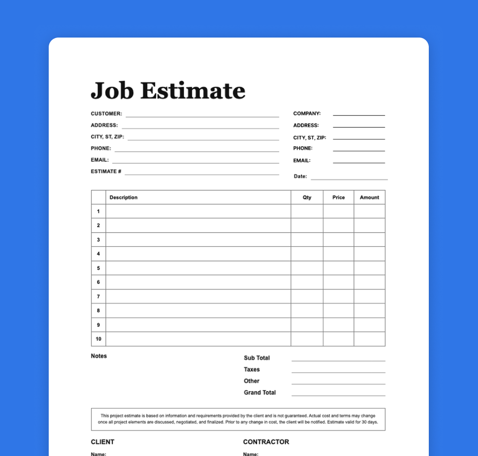 Whether you prefer a bold “Job Estimate” format, a more minimal “Estimate” layout, or a structured version with clearer section separation, each form is built to help you present clean, organized, and client-ready estimates.