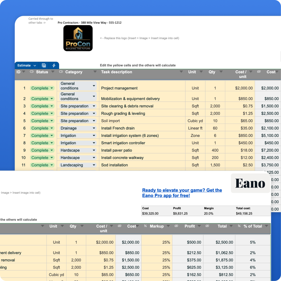 Landscaping projects require clarity. Between materials, labor, equipment, and changing site conditions, small estimating mistakes can impact your margin quickly. This Landscape Estimate Template helps you create organized, professional, client-ready estimates that build trust and win jobs. Whether you're bidding planting jobs, hardscapes, irrigation installs, or full landscape renovations, this template gives you a structured system for quoting confidently.