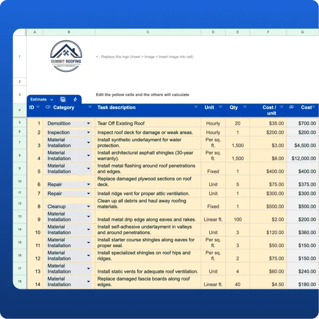 This free Roofing Estimate Template is delivered as a Google Sheets file you can copy and customize for your business. It includes: